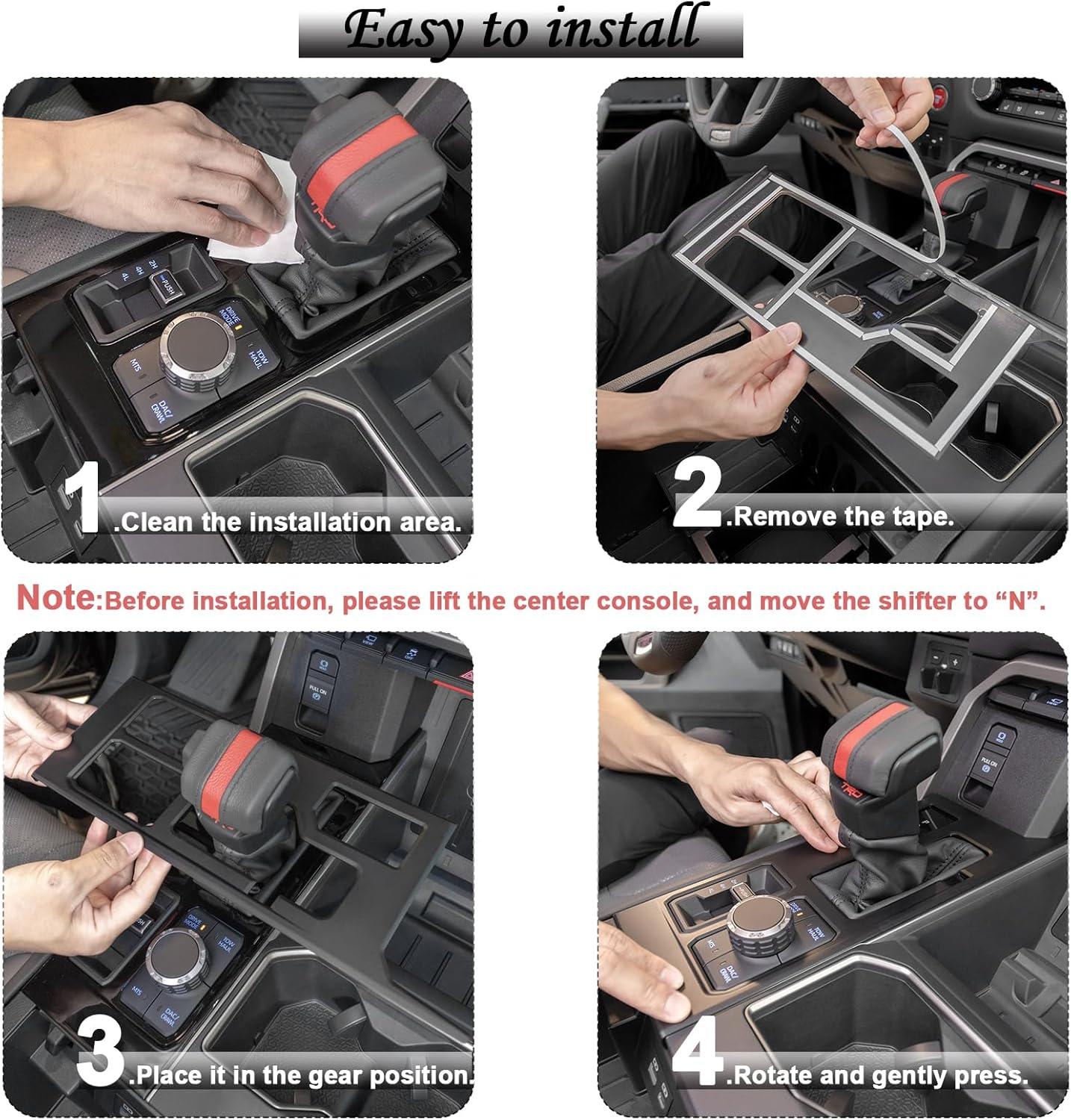 Vehicle Fit:The Car Gear Shift Panel Trim Cover is compatible with Tundra / Sequoia 2022-2025 2026. Simply remove the double-sided adhesive and stick it on, will not affect the use of the gear shift or button.