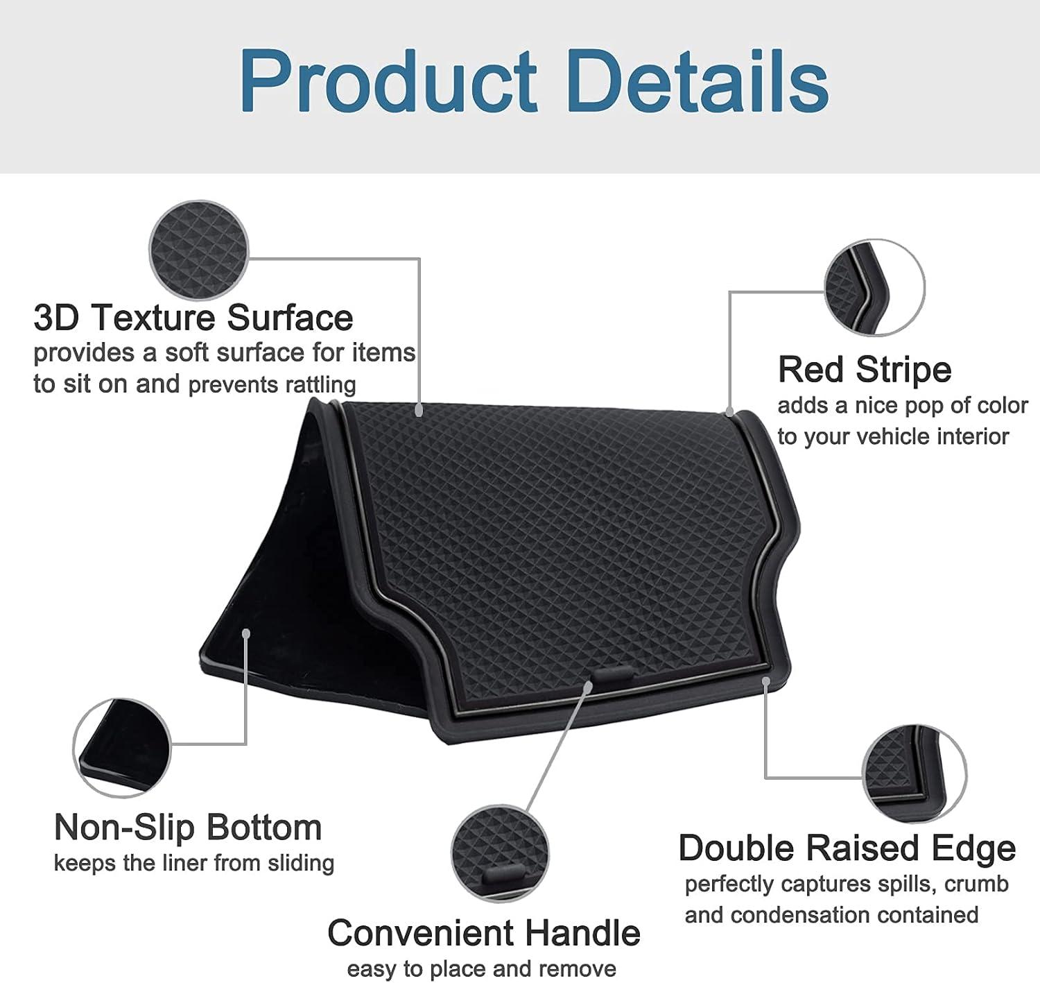 【ANTI SLIP& NOISE REDUCING】Made from high quality rubber and designed with a 3D texture surface. All of the liners are stay in place with the help of the non-slip bottom. With these inserts like coins, keys, and more won't rattle as you drive on the road.