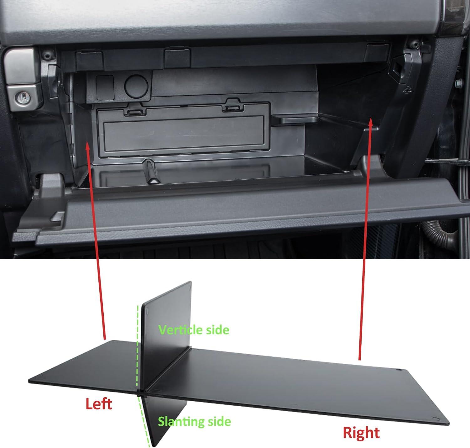 Glove Box Organizer—【INSTALL IN A FLASH】 Note:You need to put the vertical divider first as far left as you can with the slot facing outward and the slanted part downward. Installation video available, please check our listing video. Or scan the QR code on the guide of installation when you get the product.