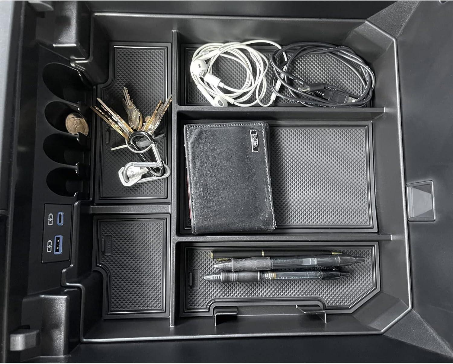 Center Console Organizer —Special Design: The console armrest box can maximize the storage in your Tundra center console. Provides additional storage space to manage your wallet, sunglasses, pens, business cards or phones, etc. There is a unique design of the area for your bank or credit card in case them missing.