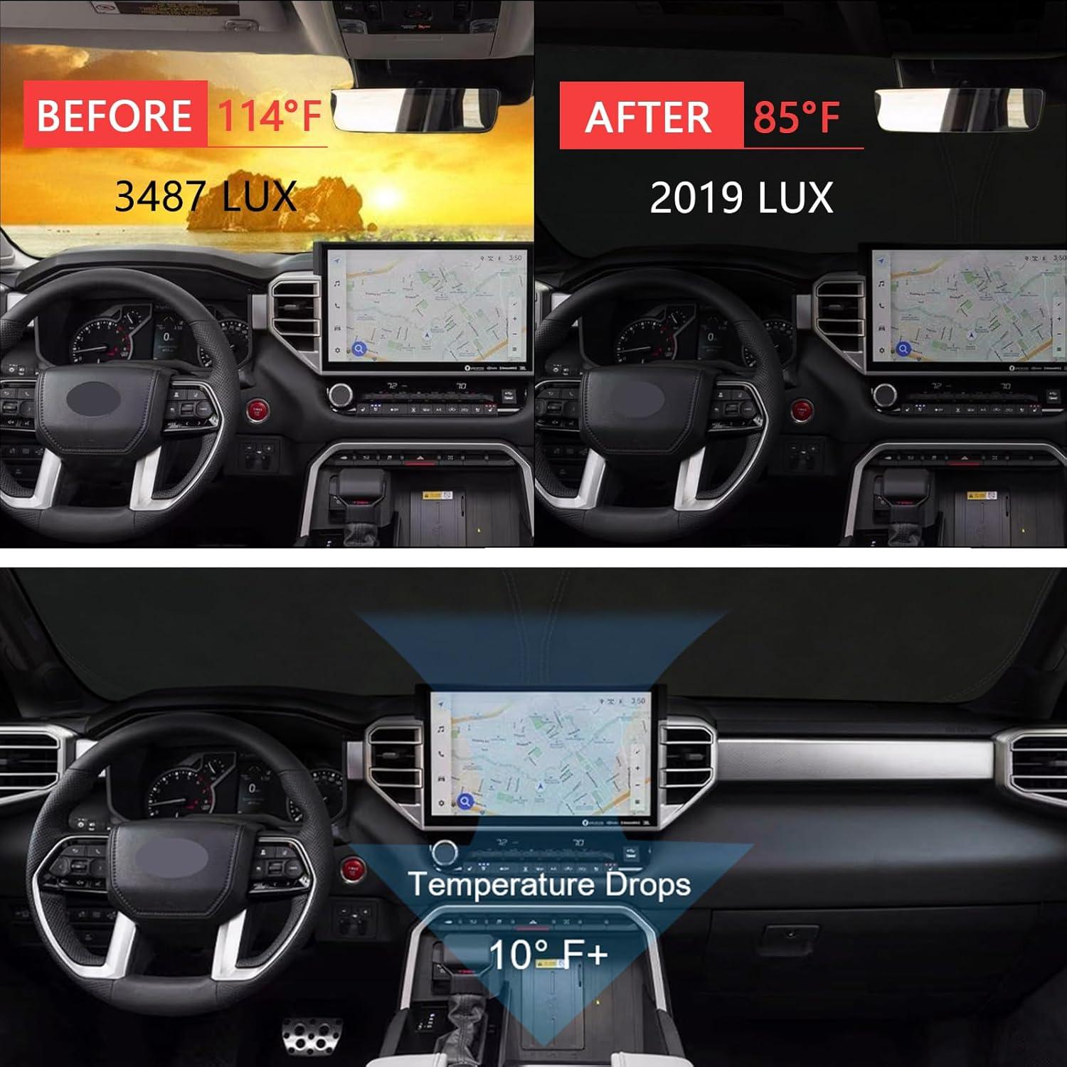 Windshield Sun Shade—High-quality materials: Made of high-quality 210T reflective polyester and uses ultraviolet reflective materials to block the sun and ultraviolet rays. The internal temperature of the 2022+ Tundra will be kept at the best level and prevent damage caused by high-temperature sunlight.