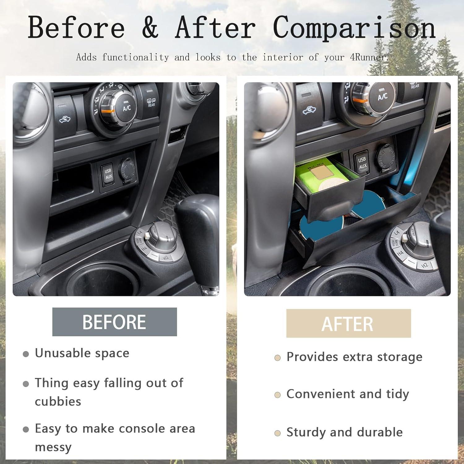 Patented Design: This Storage Drawer fits for 2014-2024 4runner. Please ensure your truck has these two cubbies before ordering, some trim levels or models might not come with these two cubbies and might have a full switchplate there instead.