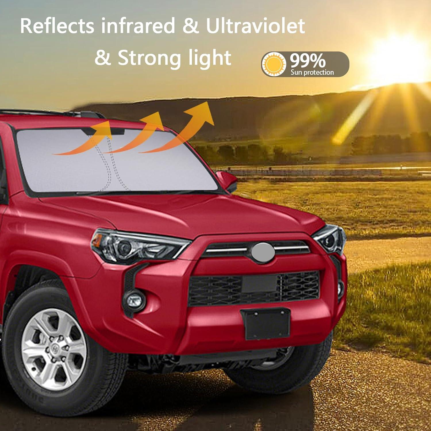 Windshield Sun Shade—High-quality materials: Made of high-quality 310T reflective polyester and uses ultraviolet reflective materials to block the sun and ultraviolet rays. The internal temperature of your 4Runner will be kept at the best level and prevent damage caused by high-temperature sunlight.
