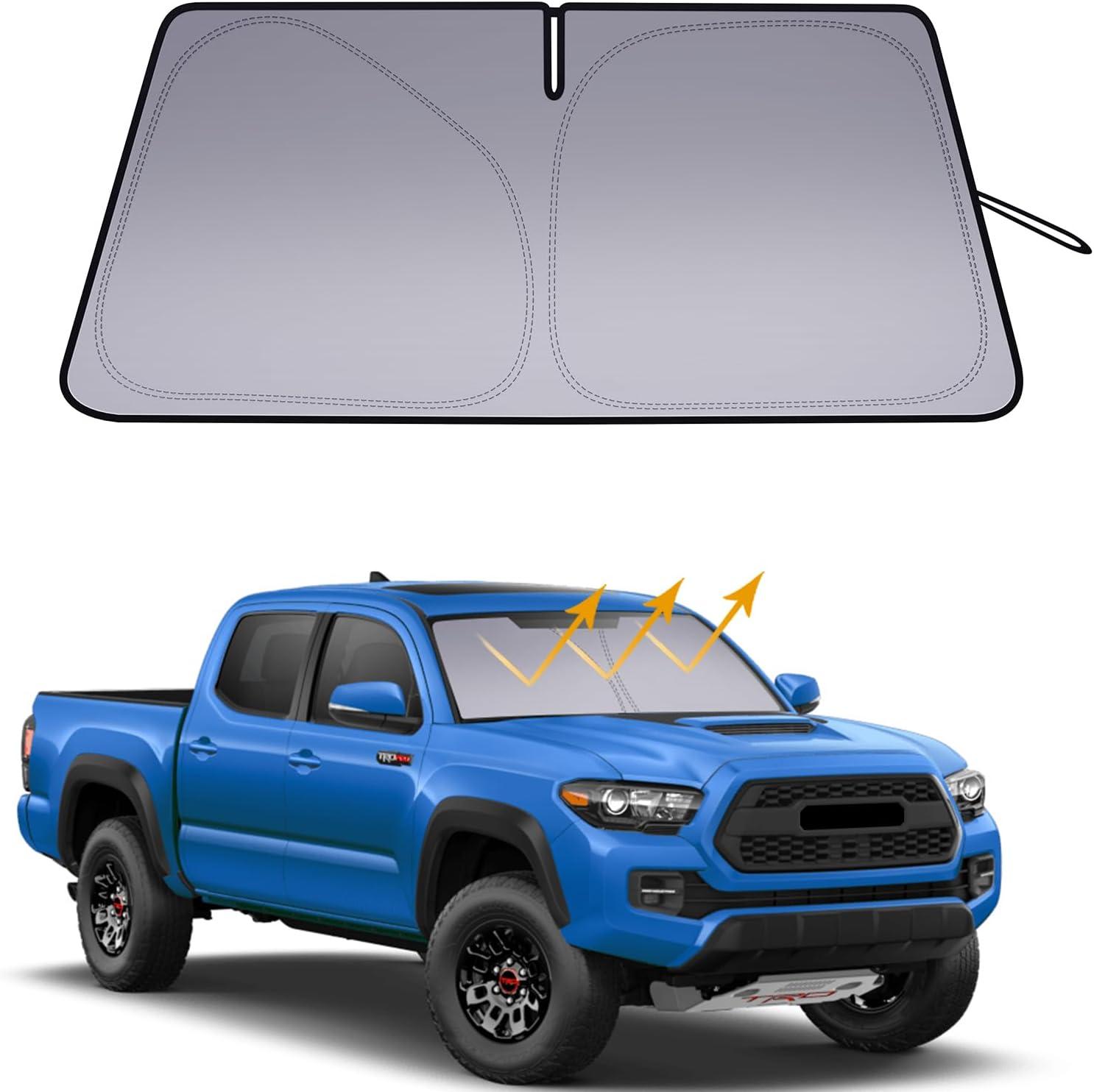Windshield Sun Shade—High-quality materials: Made of high-quality 310T reflective polyester and uses ultraviolet reflective materials to block the sun and ultraviolet rays. The internal temperature of your Tacoma will be kept at the best level and prevent damage caused by high-temperature sunlight.